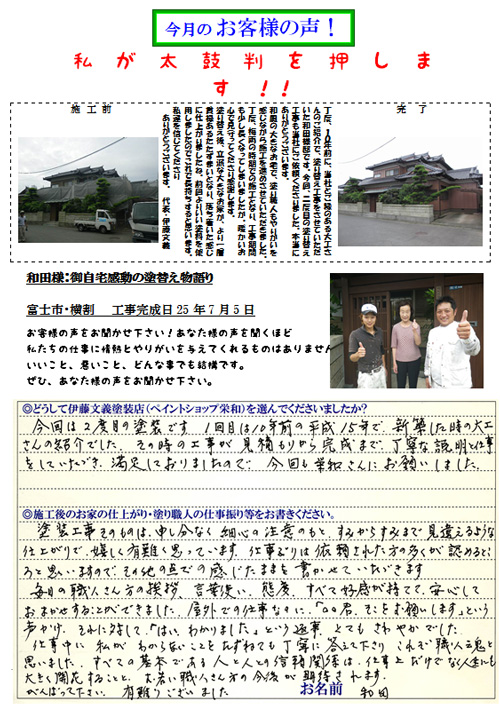 - ポスティングされていたチラシの富士宮・兄弟という言葉だけなぜか覚えていました。しばらくしてからインターネットで検索し、HPを拝見させていただいた所、知人が施工していたため話を聞きに行き、「とにかく仕事が丁寧な所だよ!!」と言われたため問い合わせさせていただきました。代表とお話しさせていただき仕事に対する情熱を感じたので、おまかせしようと思いました。