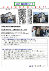 - 毎朝、気持ちよい挨拶から始まり、終了時には日誌をそえて、必ず声を掛けてくれるなど、礼儀がいきとどいて感心しました。特に、網戸の補修や内扉の塗装、家の中の面倒な図々しい注文にも気持ちよく受けて頂き、本当に助かりました。工事期間がかかりましたが、細かいお気遣いに感謝しています。有り難うございました。