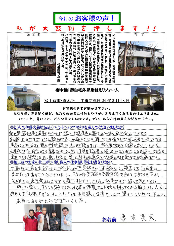 - 当初の予定は、2月2日~27日でしたが、天候不順にて完成が3月16日になりましたが、晴れ間が少ない中での作業で、申し訳ないほど、回数を分けての仕事をしていただき本当にありがとう御座いました。 伊藤塗装店の方々には、朝と帰りの挨拶を気持ちよくしていただき、わたくしたちも安心して仕事をしていただく事ができました。又作業終了時に小さなゴミ一つも残さぬように、掃除を徹底されて感心しました、工事写真帳により、詳細部まで説明をいただき、改めて、皆様方の丁寧な仕事にお礼申し上げます。